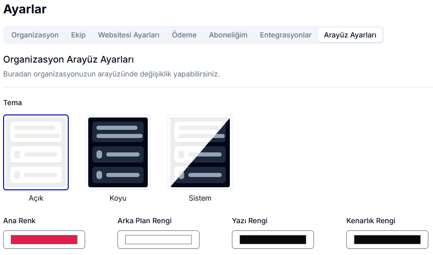 Organizasyonunuzun arayüzünü ve kullanıcı deneyimini Arayüz sekmesinden isteğinize göre özelleştirebilirsiniz.