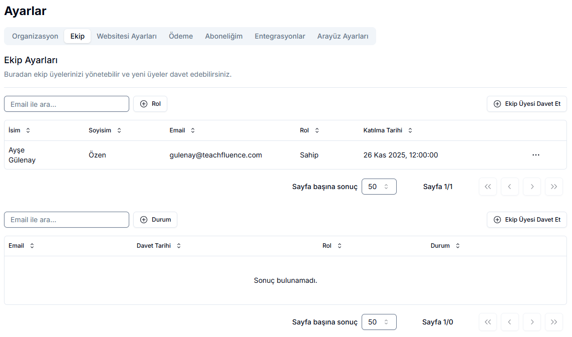 Organizasyonunuzdaki ekip üyelerinizi yönetmek ve yeni ekip üyesi davet etmek için Ayarlar > Ekip sekmesini kullanabilirsiniz. Bu sekmede, mevcut ekip üyeleriniz detaylarıyla birlikte listelenir (İsim, Soyisim, E-mail, Rol ve Katılma Tarihi). Listenin üst kısmındaki arama kutusunu kullanarak üyeleri e-mail adresleriyle hızlıca bulabilirsiniz.