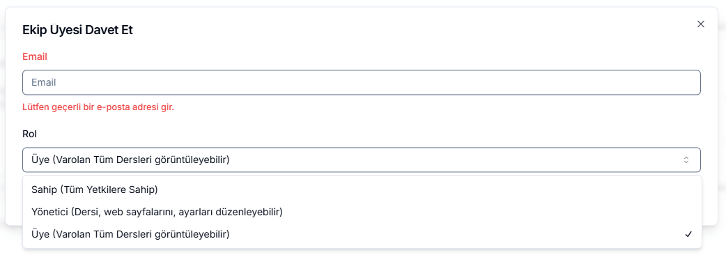 Yeni bir üye davet etmek için Ekip Üyesi Davet Et butonunu kullanabilir, davet etmek istediğiniz kişinin mail adresini girip uygun rolü atayarak daveti gönderebilirsiniz.