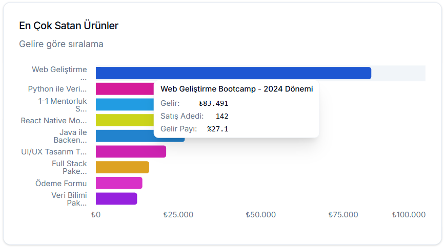 Bu bölümde ürünleriniz gelire göre sıralanarak listelenir. Grafik üzerinden en çok gelir getiren içerikler, ürünlerin satış hacimleri, satış adetleri ve gelir payı oranı görüntülenir. Bu bölüm, hangi kurs veya paketlerin daha yüksek performans sergilediğini belirlemenize yardımcı olur.
