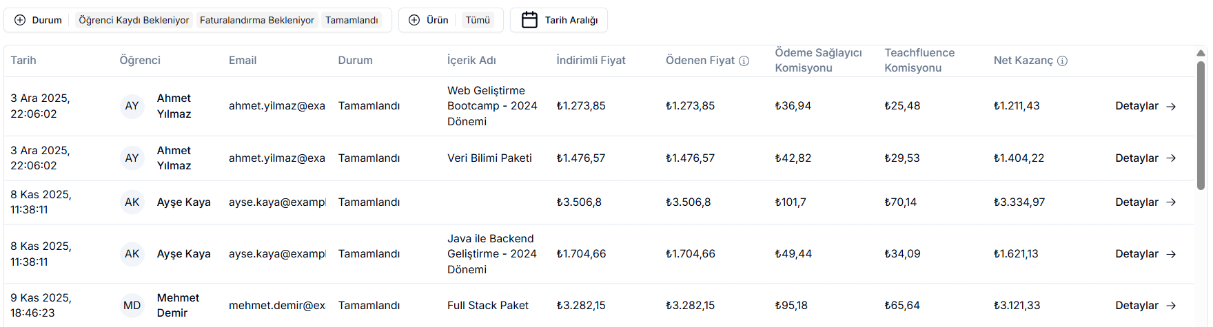 Sayfanın alt kısmında tüm satışlarınıza dair detaylı bir tablo bulunur. Bu tabloda, Tarih, Öğrenci, Email, Durum, İçerik Adı, İndirimli Fiyat, Ödenen Fiyat, Ödeme Sağlayıcı Komisyonu, Teachfluence Komisyonu ve Net Kazanç gibi tüm finansal bilgilere ulaşabilir, her bir kayıtı detaylıca incelemek için ilgili kayıt satırındaki “Detaylar” butonu üzerinden sipariş özeti, müşteri bilgileri, kurs bilgileri ve faturalar gibi ek detayları görüntüleyebilirsiniz.