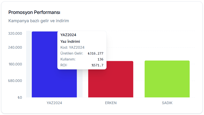 Promosyon kodu kullanan kampanyalarınızın gelir etkisi bu bölümde görselleştirilmiş şekilde gösterilir. Her kampanya için üretilen gelir, promosyon kullanım sayısı, ve ROI (Yatırım Getirisi) oranı sunulur. Böylece promosyon stratejilerinizi gerçek satış verilerine göre optimize edebilirsiniz.