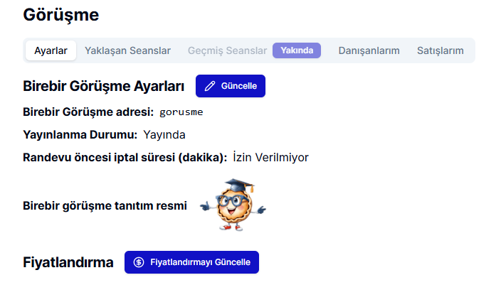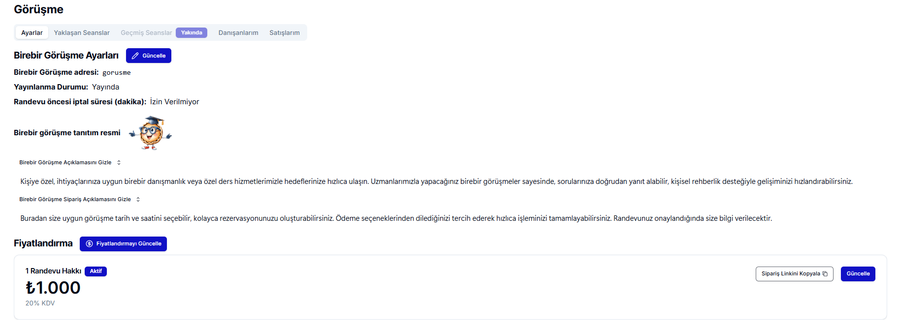 Birebir görüşme oluşturduktan sonra görüşmeniz aşağıdaki görseldeki gibi görünecektir. Görüşme adresi, yayınlanma durumu, randevu öncesi iptal süresi, tanıtım resmi ve fiyatlandırmaya dair detaylar yer alacaktır.