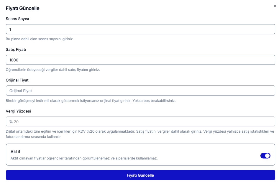 Fiyatlandırmada yapılacak değişiklikler için Fiyatlandırmayı Güncelle butonu ile açılan ekrandan seans sayısını, satış fiyatını ve orijinal fiyatı (eğer indirim mevcutsa) güncelleyebilirsiniz.