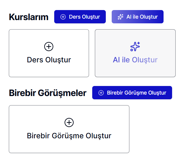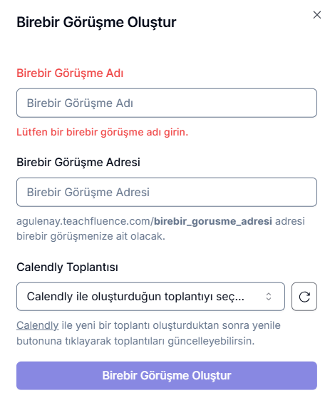 Kurslar sayfasında yer alan Birebir Görüşmeler bölümündeki Birebir Görüşme Oluştur butonuna tıklayarak yeni bir birebir görüşme ekleyebilirsiniz. Açılan sayfada Görüşme Adı, Görüşme Adresi ve Calendly takvim entegrasyonu alanlarını doldurarak birebir görüşmenizi oluşturabilirsiniz.