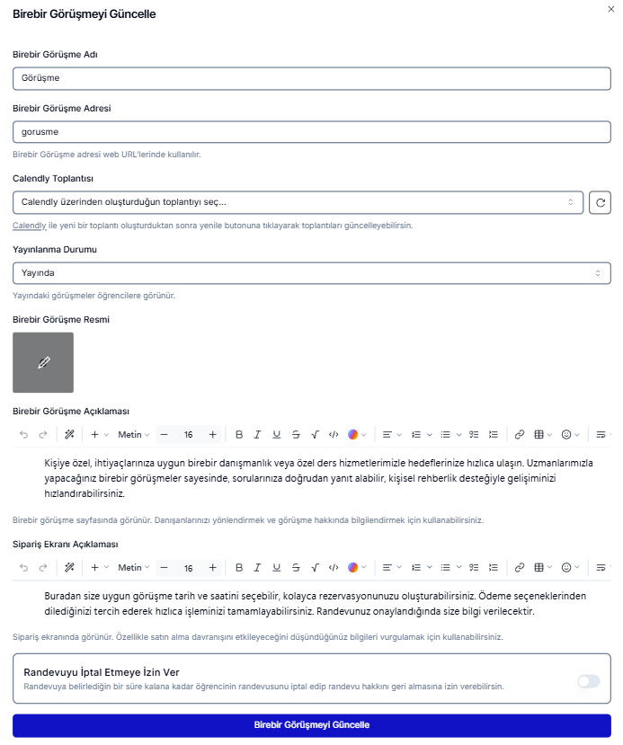 Güncelle butonuna tıklayarak açılan sekmeden dilediğiniz zaman görüşme adını, adresini, calendly ile oluşturulan toplantıları, yayınlanma durumunu, tanıtım resmini, birebir görüşme ve sipariş ekranı açıklamalarını ve randevu iptal etme izin durumunu değiştirebilir veya güncelleyebilirsiniz.