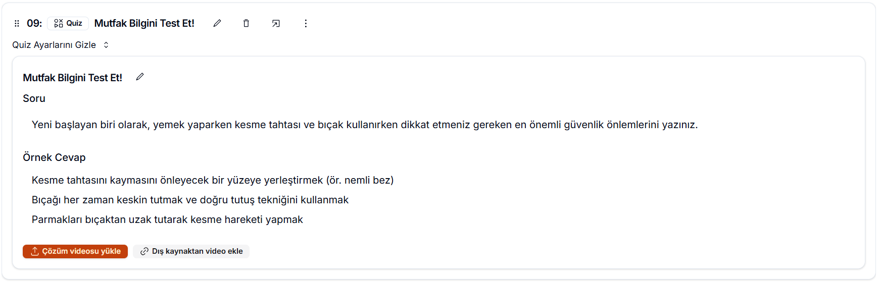 Quizinizi tamamladıktan sonra, özet görünümden soruyu ve örnek cevabı inceleyebilir, gerekirse kalem ikonuna tıklayarak değişiklik yapabilirsiniz. Ayrıca dilerseniz video ekleyerek, sorunun çözümünü öğrencilerle paylaşabilir ve öğrenme deneyimini daha görsel ve anlaşılır hâle getirebilirsiniz.
