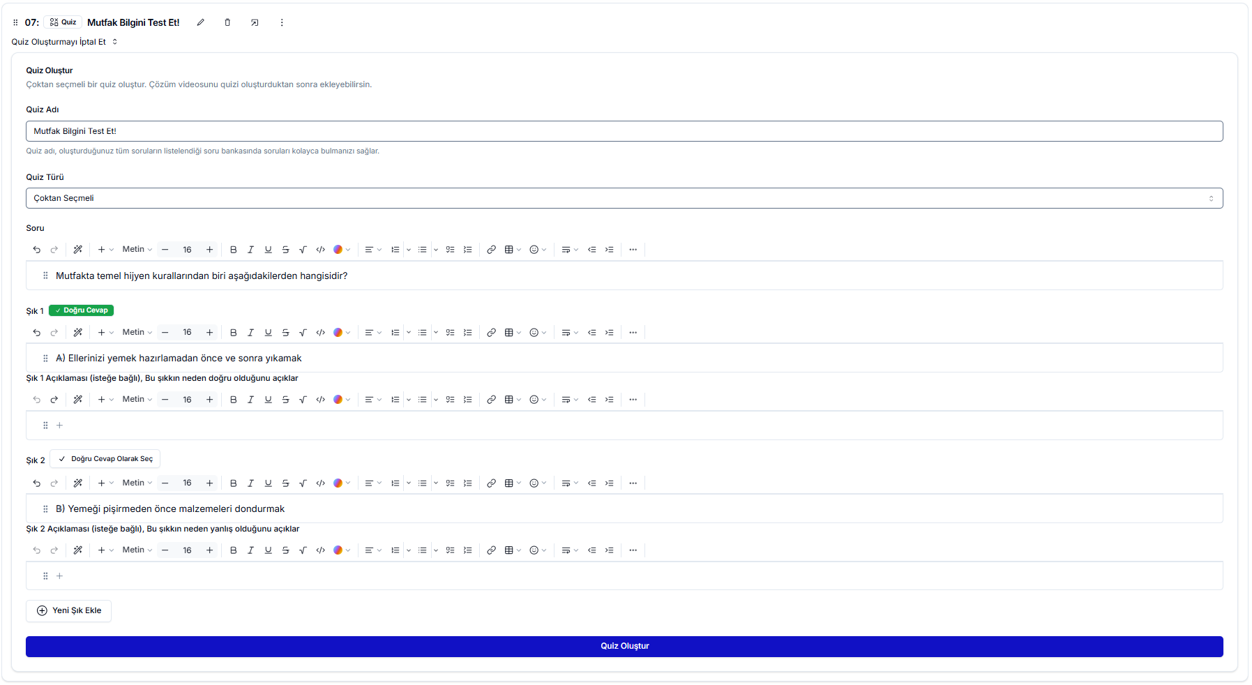 Çoktan Seçmeli Soru tipinde bir quiz oluşturmak için öncelikle sorunun açıklamasını yazabilir ve ihtiyaç duyduğunuz tüm şıkları zengin metin editörü üzerinden ekleyebilirsiniz. Tüm şıkları oluşturduktan sonra doğru cevabı belirlemek için ilgili şıkkın yanındaki “Doğru Cevap Olarak Seç” butonunu kullanabilir, gereksiz veya fazla eklenmiş şıkları temizlemek için “Sil” seçeneğinden yararlanabilirsiniz.