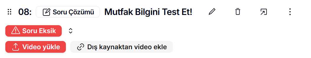 Soru Çözümü seçtiyseniz, çözüm videosu ve soru metni eklenmediği için “Soru Eksik” ve “Video Eksik” uyarıları görüntülenir.