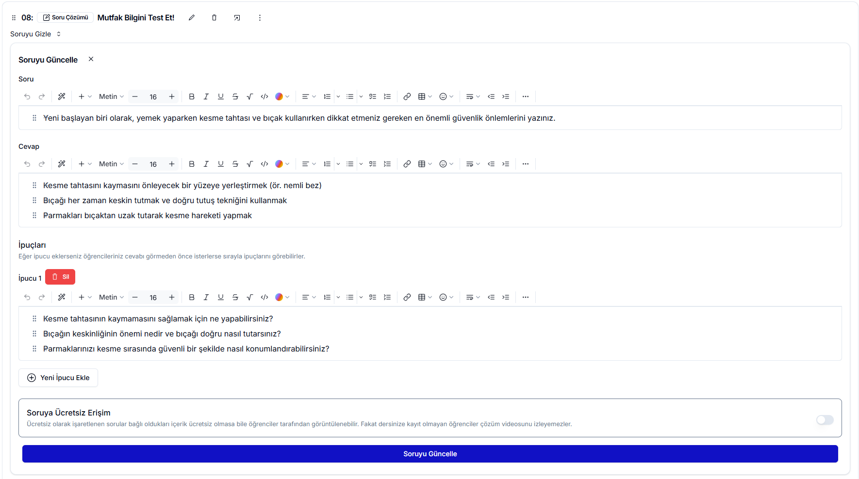 Soru Çözümü türü, öğrencilerle video ve ipuçlarıyla desteklenmiş detaylı bir çözüm sunmanıza olanak tanır. Panel üzerinden sorunun çözüm videosunu kolayca yükleyebilir ve soru ile cevabının yanında, öğrencilerin tek tek göreceği biçimde ipuçları ekleyebilirsiniz. İsterseniz Ücretsiz Erişim butonunu kullanarak, derse kayıtlı olmayan öğrencilerin de soruya erişmesine izin verebilirsiniz. Bu özellik, dersinizin demo içeriğini satış aşamasında potansiyel öğrencilere göstermek için idealdir.