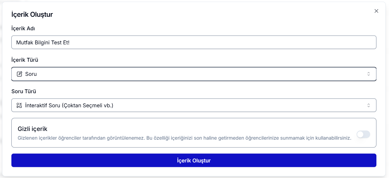Soru içerik türü oluşturmak için, oluşturmak istediğiniz bölümün altındaki Yeni İçerik Oluştur butonuna tıkladığınızda açılan panelden içerik türünü Soru olarak seçmeniz yeterlidir. Bu aşamada İnteraktif Soru ve Soru Çözümü olarak iki farklı türden birini belirleyebilirsiniz. Dilerseniz içeriğin öğrencilere görünürlüğünü Gizli İçerik seçeneğiyle ayarlayabilirsiniz.