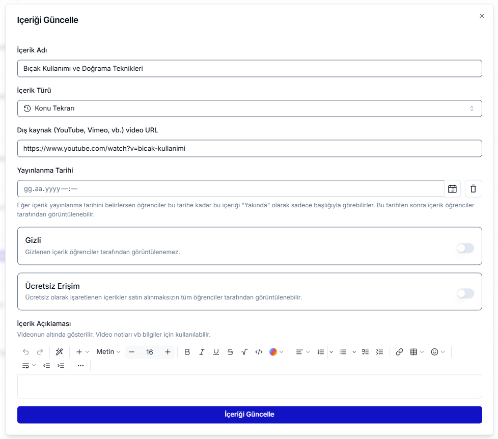 - Ücretsiz Erişim: Eğer bu seçenek açılırsa, dersi satın almayan öğrenciler de videoyu izleyebilir.
