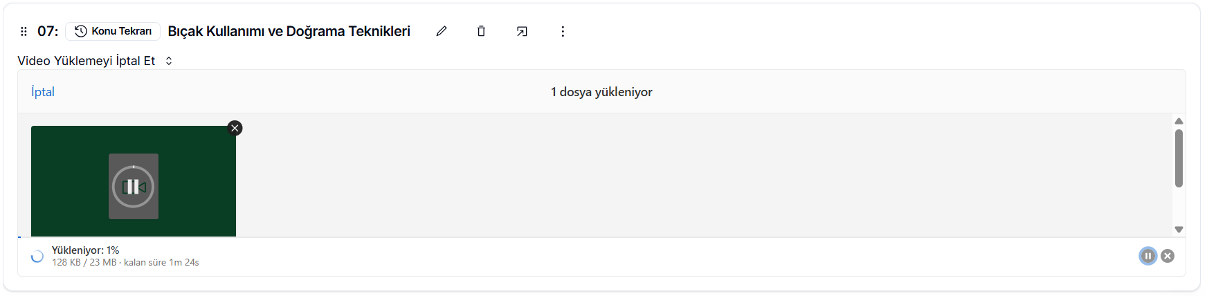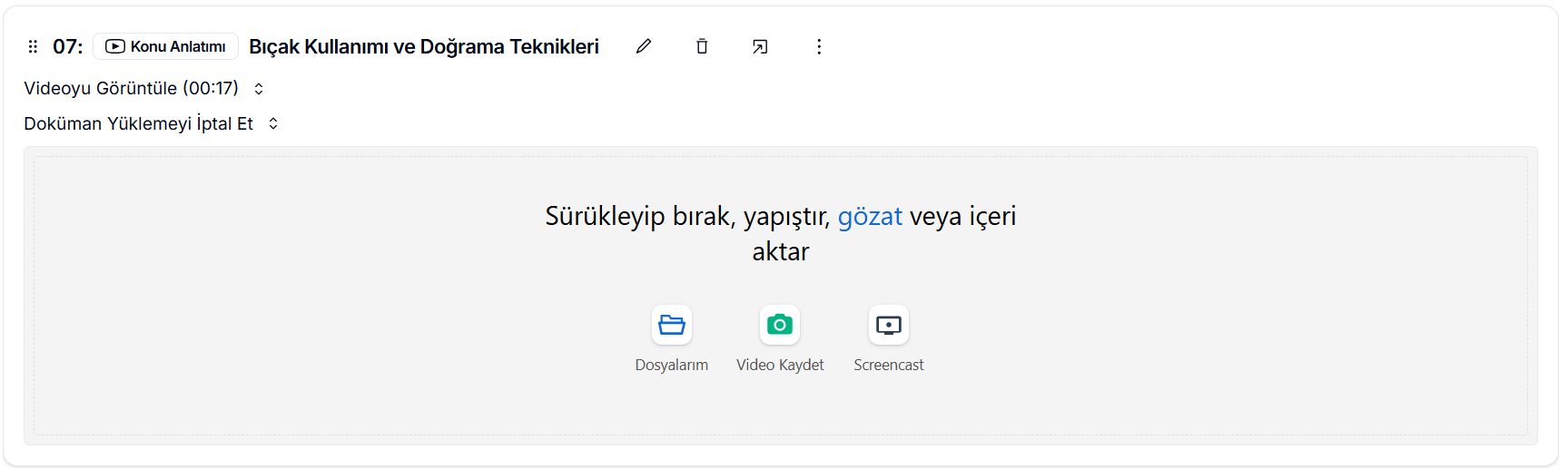 İçerik Oluştur butonuna bastıktan sonra, bölümün altında oluşturduğunuz yeni içeriği görebilirsiniz. Ancak henüz video yüklemediğiniz için içerik bu hâliyle eksik olacaktır. Bu aşamada dilerseniz videonuzu bir dış kaynaktan (ör. YouTube, Vimeo) ekleyebilir veya kendi bilgisayarınızdan istediğiniz videoyu yükleyebilirsiniz.