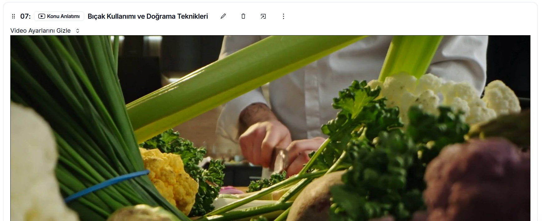 Çöp Kutusu İkonu: Çöp Kutusu İkonu: Videonuzu dersinizden kaldırmak için kullanılır. İkona tıkladıktan sonra açılan İçeriği Sil butonuyla videoyu kalıcı olarak silebilirsiniz.