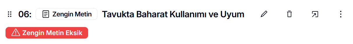 Metninizi oluşturduktan sonra, bölümün altında yeni içeriğinizi görebilirsiniz. Ancak henüz herhangi bir metin eklenmediği için içerik bu aşamada eksik kabul edilir ve ekran görüntüsünde gösterildiği gibi “Zengin Metin Eksik” uyarısı ile karşılaşırsınız.