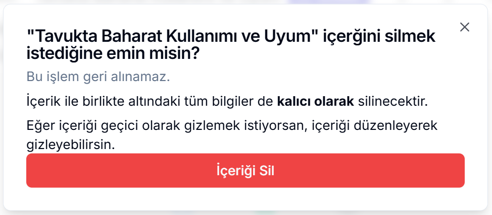 Çöp Kutusu İkonu: Metni kalıcı olarak dersinizden kaldırmak için bu ikona tıkladıktan sonra açılan İçeriği Sil butonunu kullanabilirsiniz.