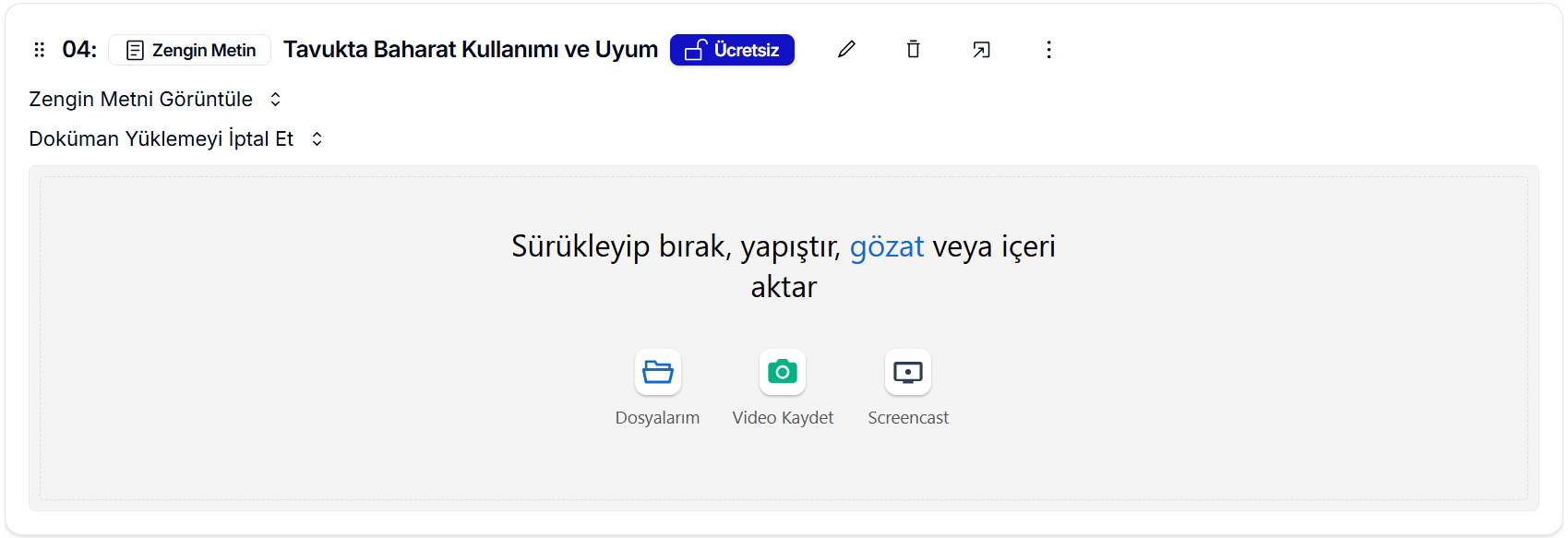 Üç Nokta İkonu: Ekstra bir doküman eklemek veya mevcut içeriğin bir kopyasını oluşturmak için kullanılır. Bu ikona tıkladığınızda açılan panelden PDF, görsel veya diğer doküman türlerini yükleyerek içeriğinizi zenginleştirebilir, dilerseniz metnin bir kopyasını oluşturarak benzer içerikleri daha hızlı hazırlayabilirsiniz.