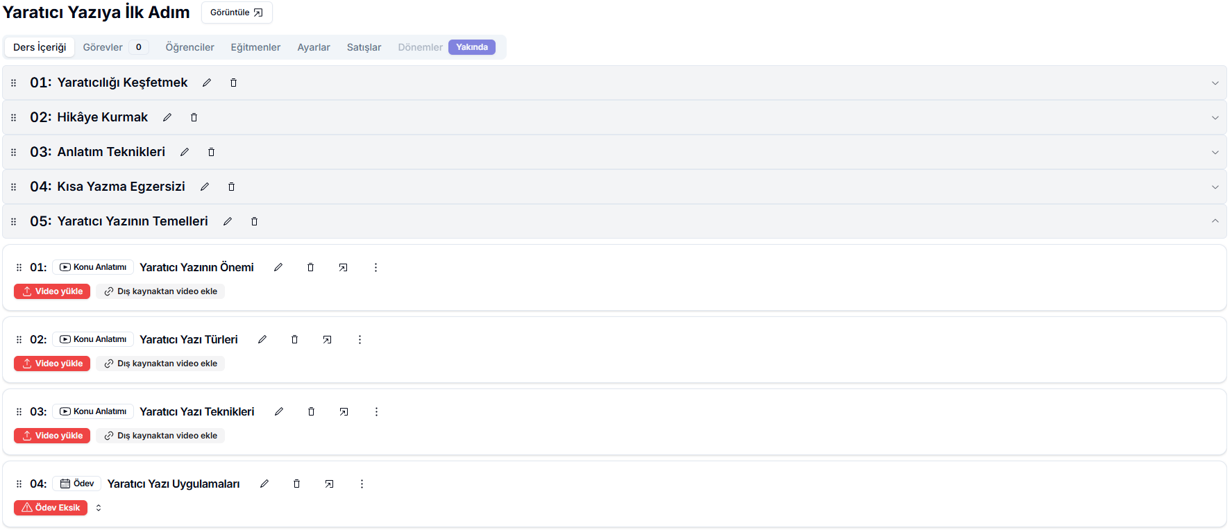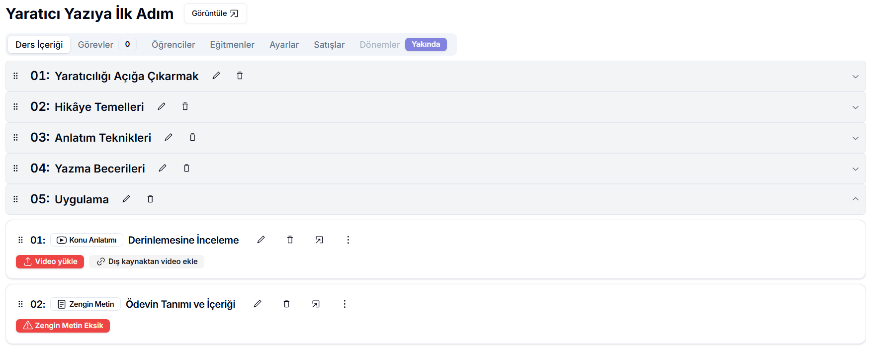 Bölümlerinizi oluşturduktan sonra, dersin altında bölümlerinizi görüntüleyebilirsiniz.