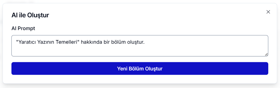 AI ile bölüm oluşturmak için AI ile Oluştur butonunu kullanabilirsiniz. Açılan panelde yer alan prompt kutucuğuna bölüm ile ilgili detayları girin. AI sizin için önerilen içerik türlerini ekleyerek bölümü oluşturacaktır.