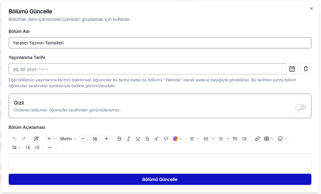 Kalem İkonu: Bölümün adını, açıklamasını, yayınlanma tarihini ve öğrenciler için gizlilik durumunu düzenlemenizi sağlar. Yayınlanma tarihi ileri alınırsa veya bölüm gizli işaretlenirse, öğrenciler bölümü göremez.