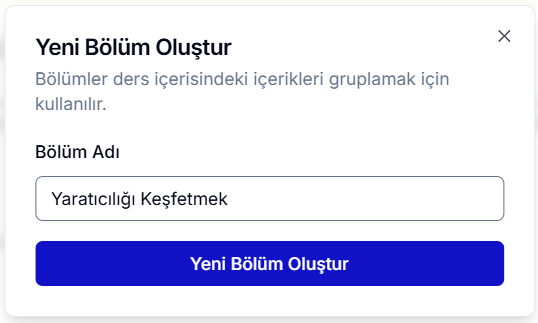 Bölümler, kursunuzu daha küçük parçalara ayırarak öğrencilerinize daha düzenli sunmanızı sağlayan yapılardır. Kusunuzu oluşturduktan sonra bölüm ekleyebilir, düzenleyebilir veya silebilirsiniz. • Yeni bölüm oluşturmak için kursun altında bulunan Yeni Bölüm Oluştur butonuna tıklayın. • Panelde bölüm adını belirleyerek ilk bölümü oluşturabilirsiniz. • Oluşturduğunuz bölümler, kursunuzun altında listelenir.
