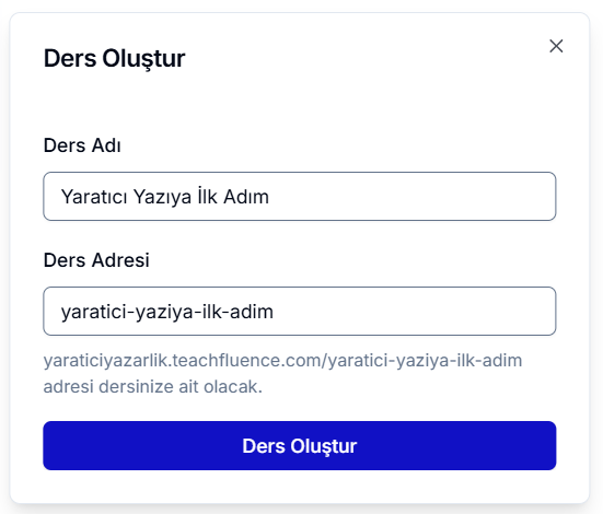 Kursunuzun akışını, bölümlerini ve içerik türlerini kendiniz belirlemek isterseniz Ders Oluştur butonunu kullanabilirsiniz. Açılan panelde kursunuzun adını ve adresini belirleyerek ilk kursunuzu oluşturabilirsiniz.