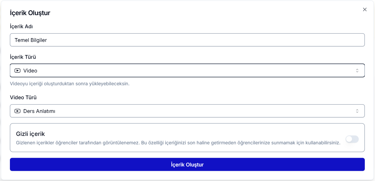 Dersinize içerik ekleme ve içerik türlerini yönetme rehberi için buraya tıklayabilirsiniz.