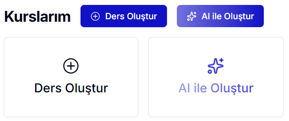 Yeni ders oluşturmak için isterseniz Ders Oluştur butonunu veya AI (Yapay Zeka) ile Oluştur butonunu kullanabilirsiniz.