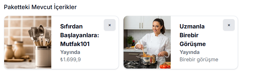 Eklediğiniz bir içeriği paketten kaldırmak isterseniz, ilgili içeriğin sağ üst köşesinde yer alan çarpı (×) ikonuna tıklayarak paketten çıkarabilirsiniz. İçerik kaldırıldıktan sonra liste güncellenir ve paket yalnızca seçili içerikleri sunmaya devam eder.