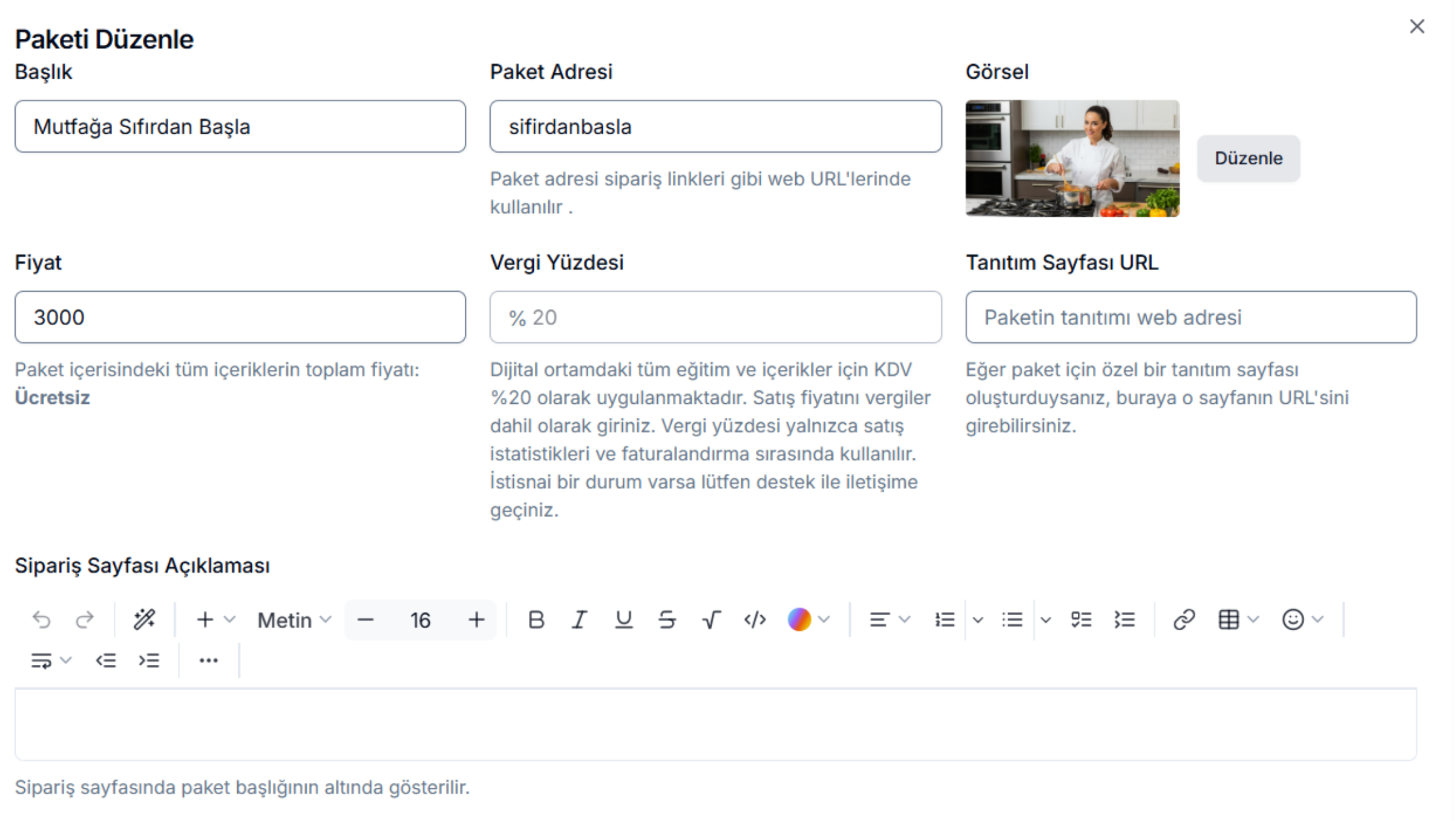 Paketinizi tanıttığınız özel bir sayfa varsa, bağlantısını Tanıtım Sayfası URL alanına ekleyebilirsiniz. Sipariş sayfasında paket başlığının altında görüntülenecek açıklamayı ise Sipariş Sayfası Açıklaması bölümüne zengin metin formatında ekleyebilirsiniz.