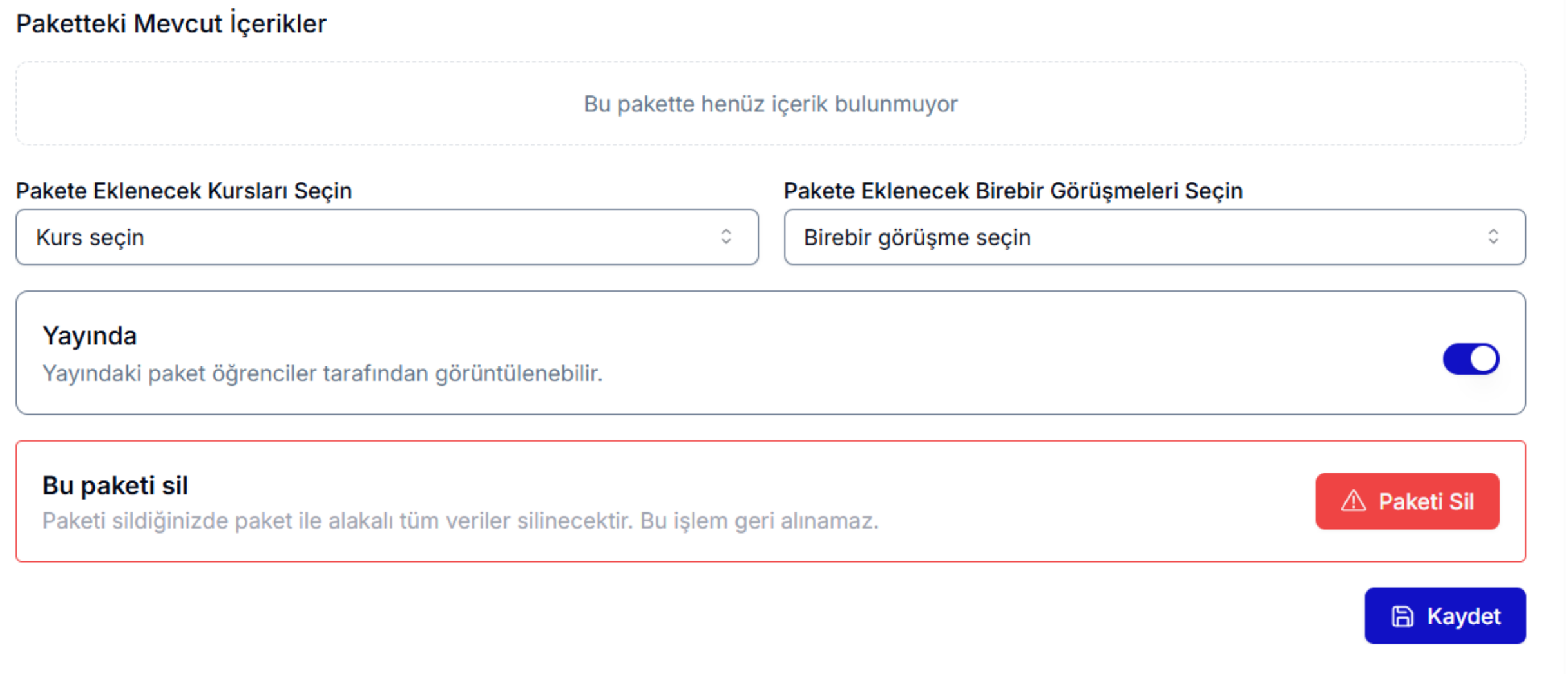Aynı ekranda, pakete dahil ettiğiniz kursları ve birebir görüşmeleri Paketteki Mevcut İçerikler bölümünde görebilir, “Kurs seçin” ve “Birebir görüşme seçin” alanlarını kullanarak içeriklerinizi paketinize ekleyebilirsiniz.