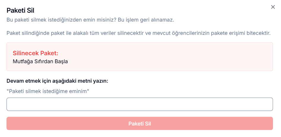 Detay sayfasının en altında yer alan Paketi Sil seçeneği, ilgili paketin kalıcı olarak sistemden kaldırılmasını sağlar. Silme işlemi geri alınamaz. Silme işlemi sırasında ekranda bir onay uyarısı görüntülenir. Bu uyarıda, paketin silinmesi hâlinde pakete ait tüm verilerin kalıcı olarak silineceği ve mevcut öğrencilerin pakete erişiminin tamamen sonlanacağı belirtilir. İşlem uygulanmadan önce, silinecek paket adı da kullanıcıya gösterilir.