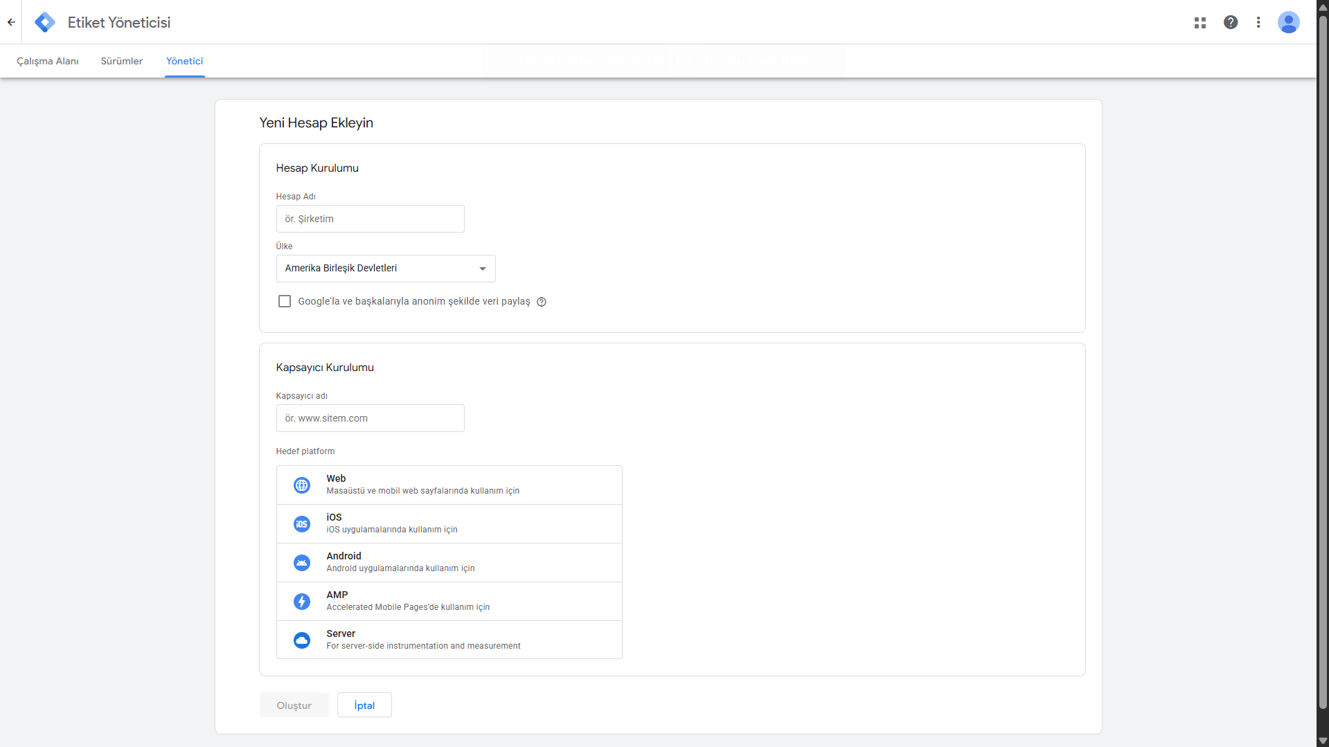 Bu aşamanın ardından Kapsayıcı Kurulumu bölümünde “Kapsayıcı Adı” belirlemeniz gerekir; bu genellikle web sitenizin adı şeklinde olur. Hedef platform olarak “Web”, “iOS”, “Android”, “AMP” veya “Server” seçeneklerinden sizin kullanımınıza uygun olanı seçersiniz.