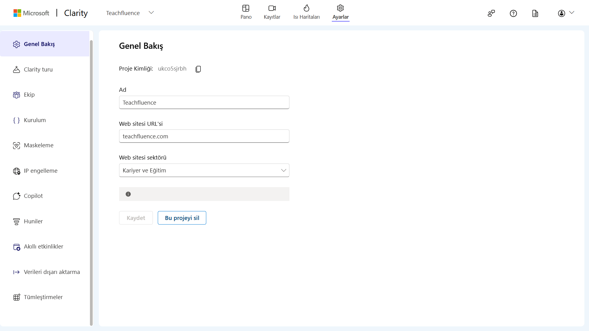 Bir proje oluşturduktan sonra solda yer alan ana menü üzerinden Genel Bakış bölümüne ulaşabilirsiniz. Bu ekran Clarity projenize ait temel verileri gösterir. Burada yer alan Proje Kimliği Teachfluence entegrasyonunda kullanacağınız en önemli bilgidir.