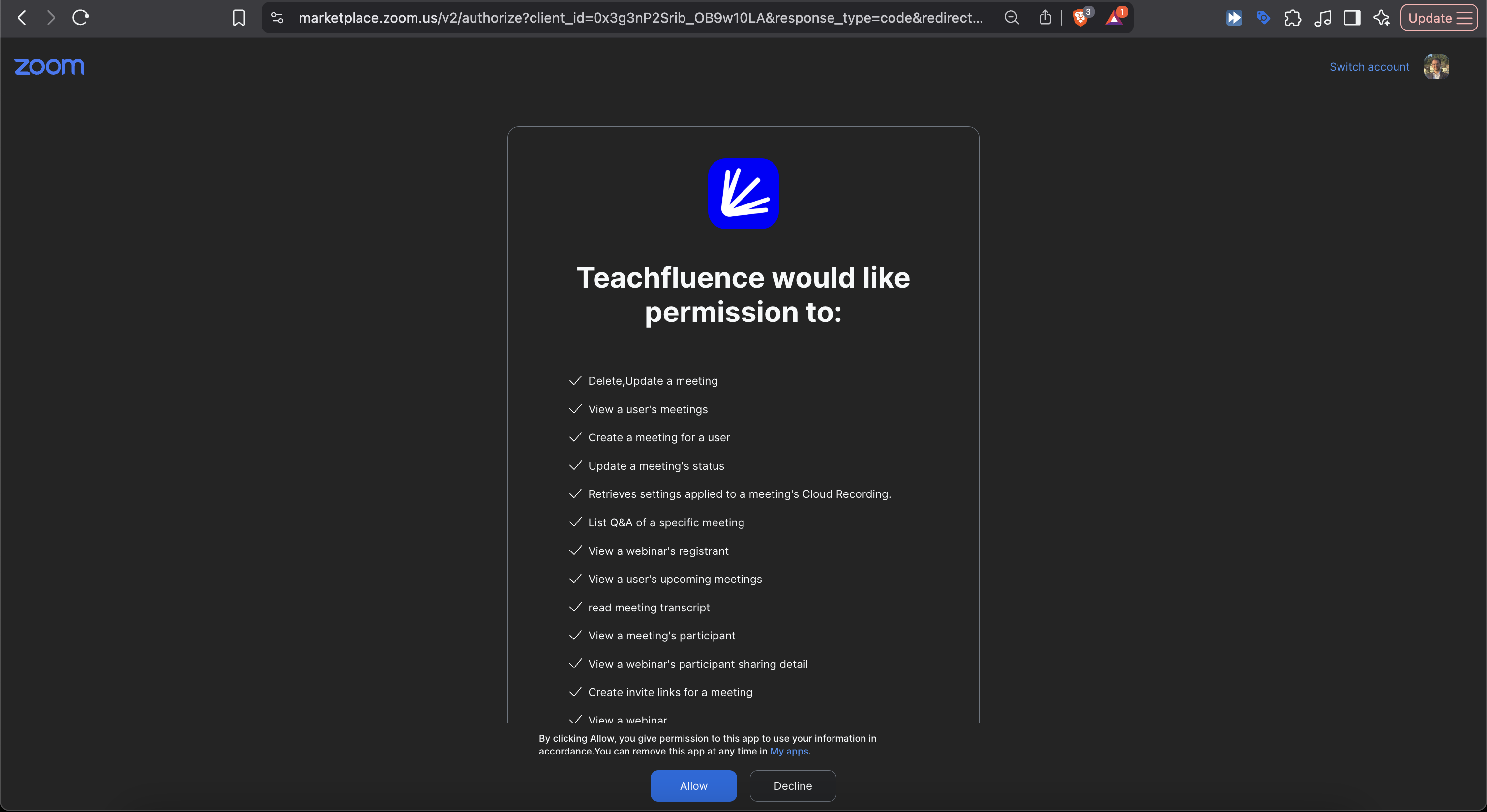 Zoom hesabınızı Teachfluence'a bağlamak için Ayarlar → Entegrasyonlar → Zoom Hesabını Bağla butonuna tıkladıktan sonra entegrasyonun tamamlanması için bir sayfaya yönlendirileceksiniz.