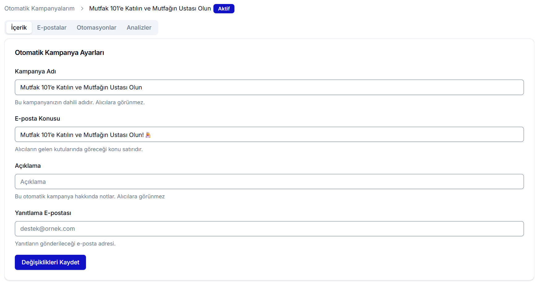 Kampanyayı oluşturduktan sonra dört temel sekme üzerinden düzenleme yapabilirsiniz: İçerik, E-postalar, Otomasyonlar, Analizler.