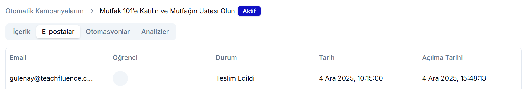 Bu sekmede, otomatik kampanyanızın gönderim durumlarını inceleyebilirsiniz. Gönderilen e-postaların listesinde alıcı e-posta adresi, öğrenci bilgisi, gönderim durumu, gönderim tarihi ve varsa açılma tarihi yer alır.