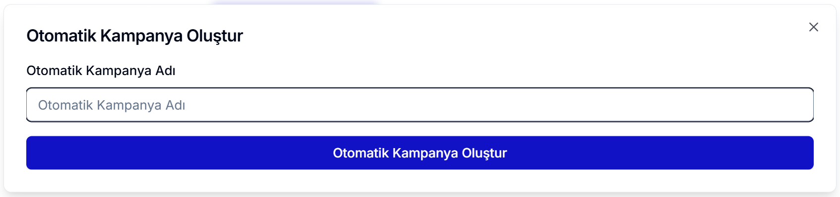 Yeni bir otomatik kampanya başlatmak için Otomatik Kampanya Adı alanına kampanyanızın adını girip Otomatik Kampanya Oluştur butonuna tıklayabilirsiniz.