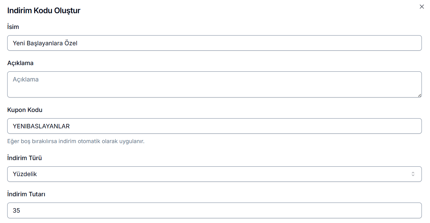 İndirim Kodu Oluştur ekranında, indirim kampanyanızı tanımlamak için gerekli tüm detayları girmeniz istenir. Bu alanda sırasıyla indirim kodu için bir isim ve isteğe bağlı bir açıklama belirleyebilirsiniz. Bu bilgiler yalnızca yönetim panelinde görünür ve indirimlerinizi ayırt etmenizi sağlar.