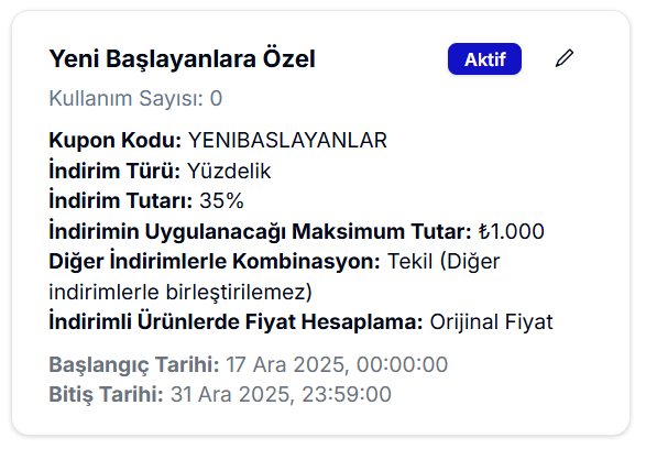 Bu ekranda, oluşturma aşamasında tanımlanan tüm alanlara ek olarak iki önemli ayar daha bulunur. Aktiflik Durumu, indirim kodunun kullanılabilir olup olmadığını belirler; pasif konuma getirilen indirim kodları ödeme ekranında kullanılamaz.