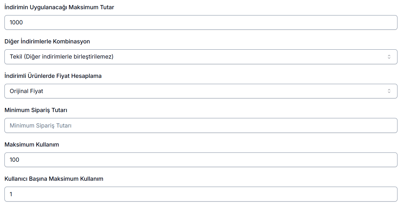 Kampanya koşullarını netleştirmek için Minimum Sipariş Tutarı, indirimin toplamda kaç kez kullanılabileceğini belirleyen Maksimum Kullanım ve bir kullanıcının indirim kodunu kaç kez kullanabileceğini belirleyen Kullanıcı Başına Maksimum Kullanım alanlarını doldurabilirsiniz.