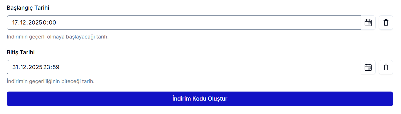 Son olarak, indirimin ne zaman aktif olacağını belirlemek için Başlangıç Tarihi ve Bitiş Tarihi seçilir. Tüm alanları doldurduktan sonra İndirim Kodu Oluştur butonuna tıklayarak indirim kodunuzu aktif hale getirebilirsiniz.