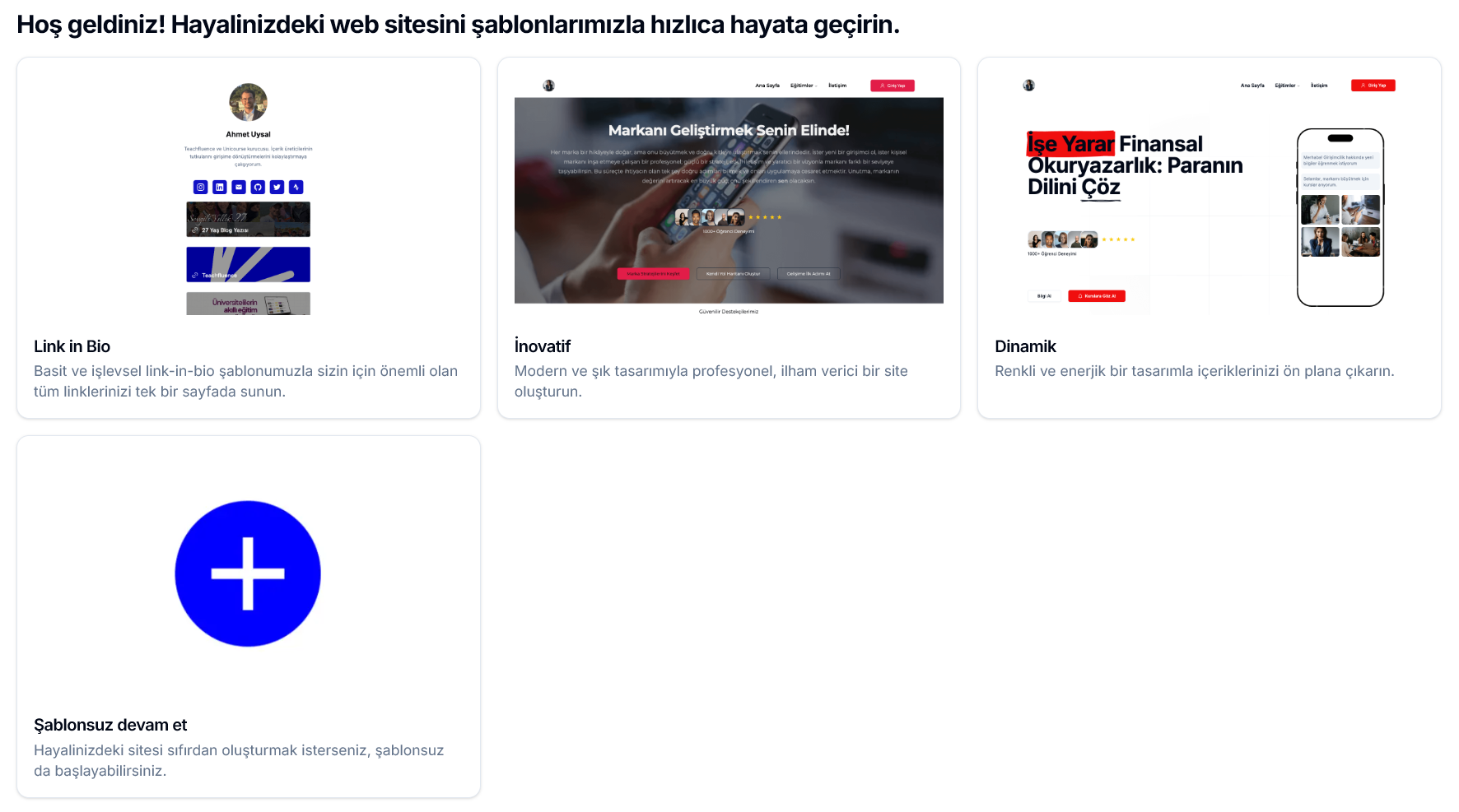 Dilerseniz hazır şablonlarımızdan, markanızın karakterine ve sunduğunuz içeriğin türüne en uygun olanı seçerek web sitenizi oluşturmaya hemen başlayabilirsiniz. Doğru şablonu seçmek, ziyaretçilerinizle kuracağınız bağı güçlendirecektir. İhtiyacınıza göre şu yönlendirmeleri takip edebilirsiniz: