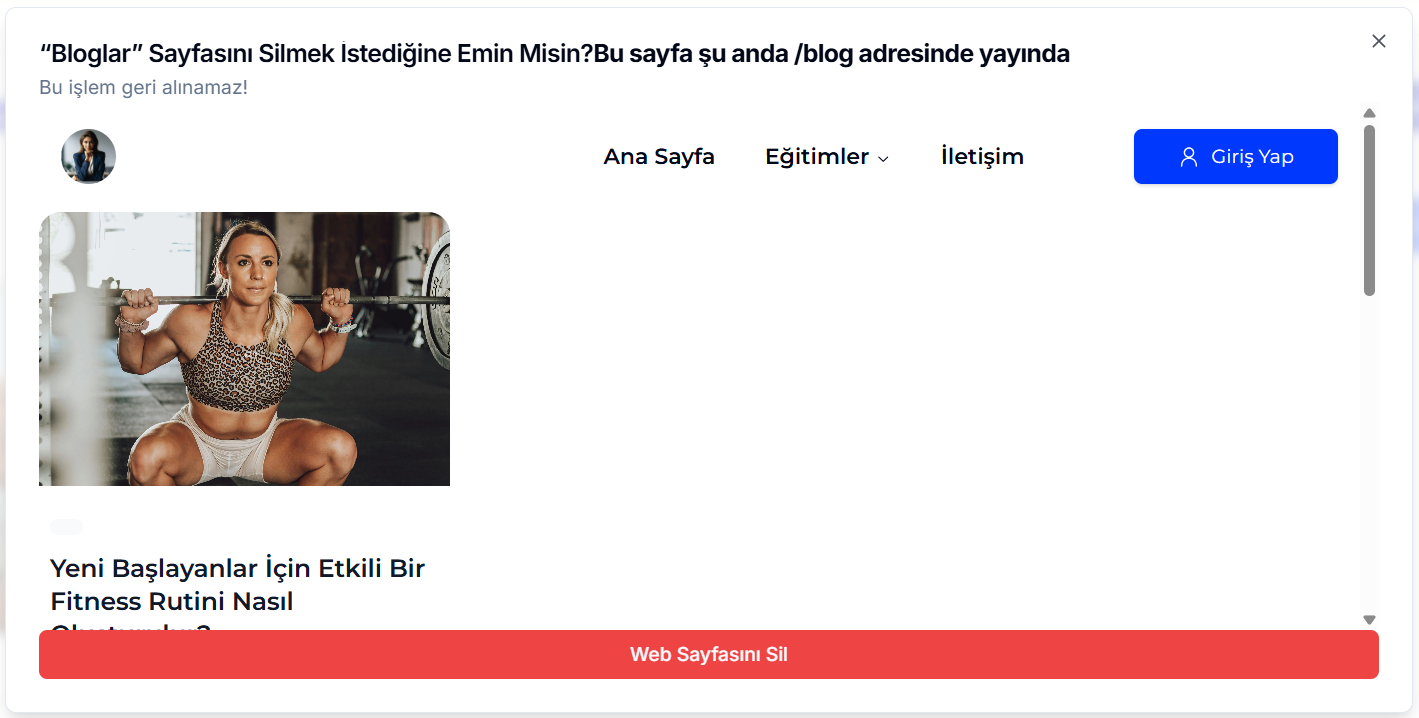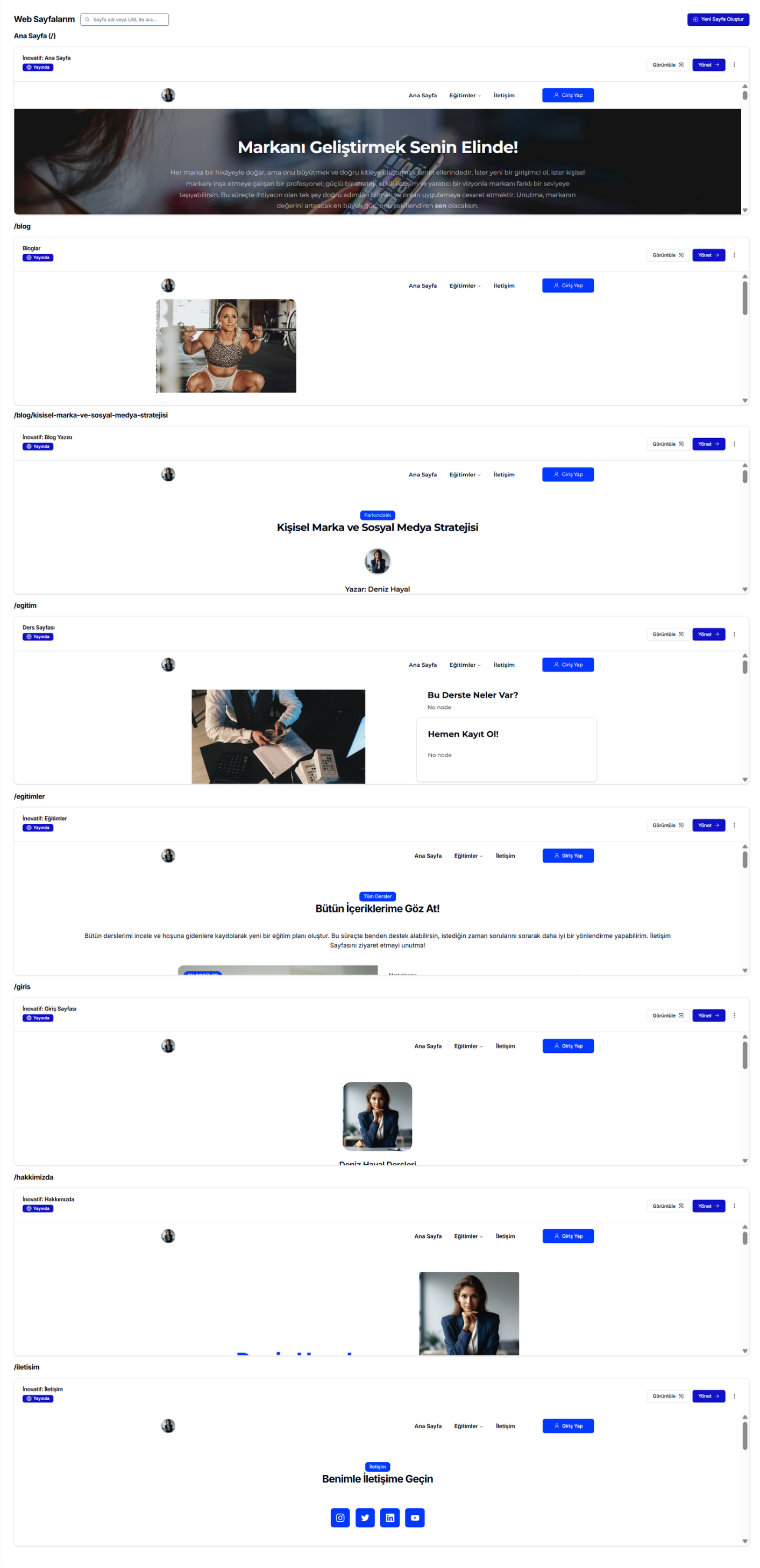 - Sayfa Yapısı: Sağ taraftaki menüden şablonun içerdiği alt sayfaları (Hakkımda, Kurslar, İletişim vb.) görüntüleyebilirsiniz.