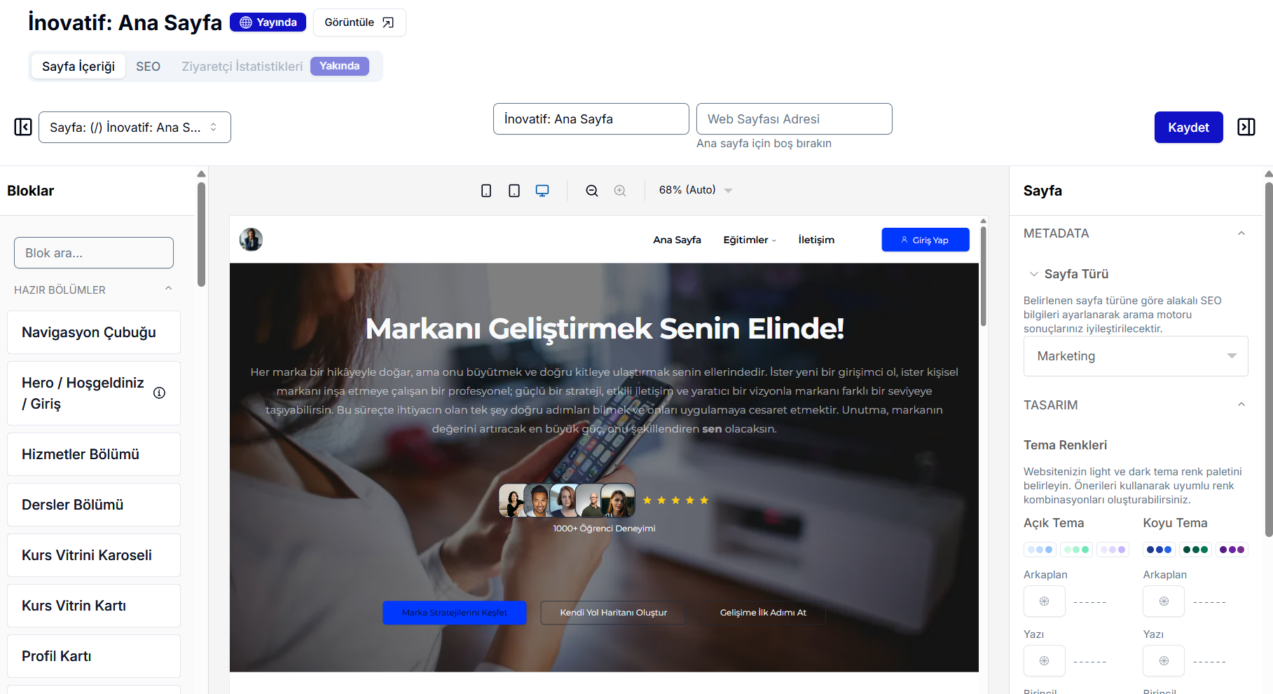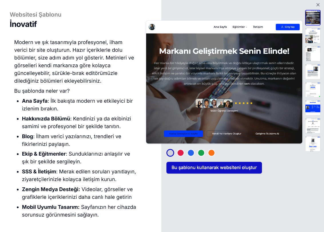 Bu bölümde, hazır şablonları kullanarak websitenizi adım adım nasıl oluşturacağınızı öğreneceksiniz. Modern ve şık tasarlanmış şablonlar sayesinde, farklı eğitim içeriklerine uygun bir siteyi kod bilgisine ihtiyaç duymadan, sadece birkaç dakika içinde yayına alabilirsiniz. Websitenizi renk temaları, fontlar ve özgün görsellerle kişiselleştirerek hayalinizdeki görünüme kavuşturabilir, kullanıcı deneyimini artıracak size özel dokunuşları kolayca uygulayabilirsiniz.