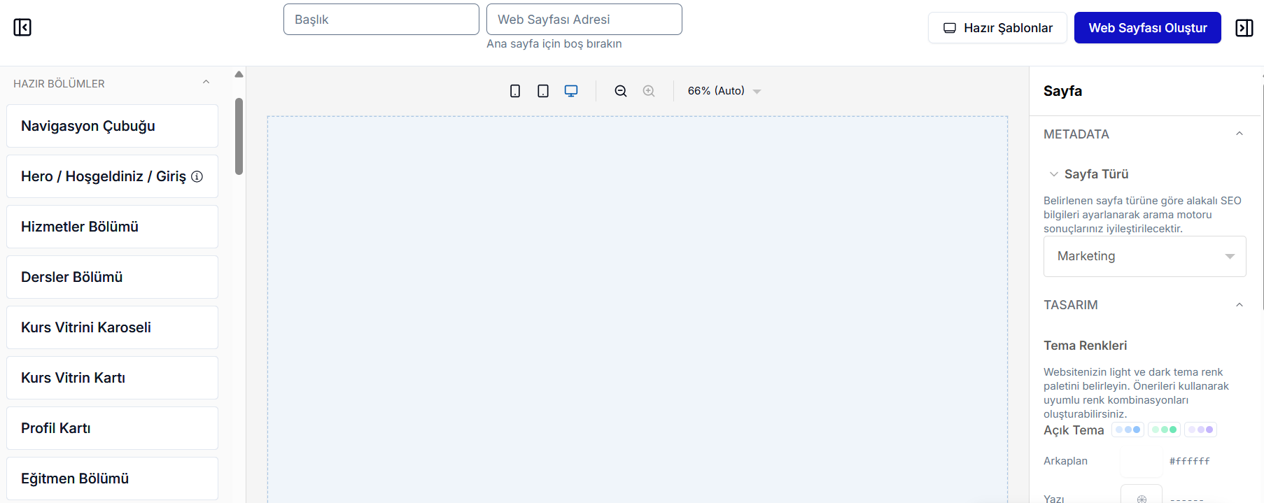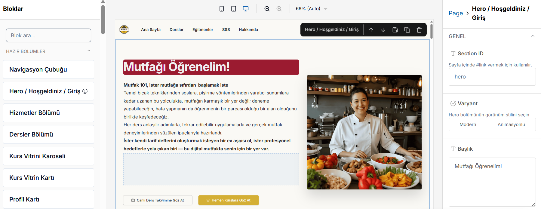 Sürükle-Bırak Editörü, web sayfalarınızı tasarlarken çeşitli bileşenleri (metin kutuları, resimler, eğitmen tanıtım bölümü vb.) sürükleyip bırakarak kolayca yerleştirebileceğiniz bir araçtır. Bu editör sayesinde, teknik bilgiye ihtiyaç duymadan, web sitenize istediğiniz bileşenleri ekleyebilir ve kişiselleştirebilirsiniz. Kendi tarzınıza ve ihtiyaçlarınıza göre sayfalarınızı özelleştirebilir, profesyonel görünümlü ve işlevsel tasarımlar oluşturabilirsiniz.