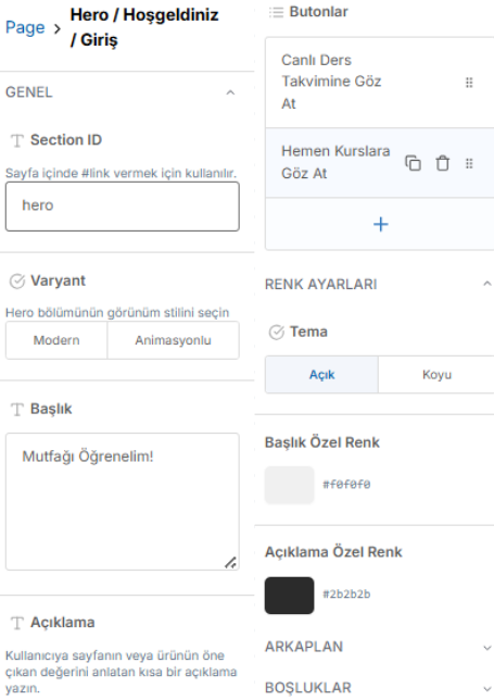 Blok Ayarları: Blok Ayarları, sayfanızdaki her bir bloğu ihtiyaçlarınıza göre kişiselleştirmenizi sağlar. Bir bloğu seçtiğinizde açılan panel üzerinden bloğun genel özelliklerini kolayca düzenleyebilirsiniz. Örneğin, Hero Bölümü için başlık ve açıklamayı değiştirebilir, modern veya animasyonlu varyantlardan birini seçebilir, buton metinlerini ve tasarımlarını özelleştirebilir, arka plan görseli ekleyip bu görsel üzerinde tasarımsal düzenlemeler yapabilirsiniz. Ayrıca, arka planın rengini, tarzını ve desenini de isteğinize göre şekillendirebilirsiniz.