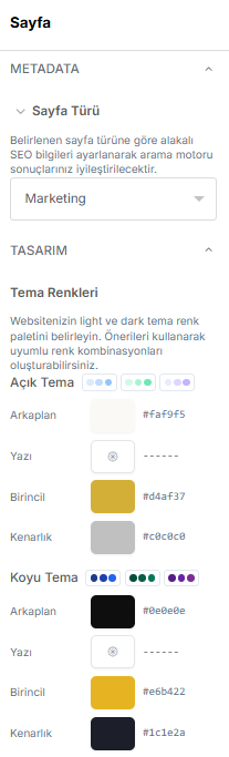 Sayfa Ayarları: Sayfa Ayarları bölümünde, sayfanızın türü ve tasarımıyla ilgili birçok düzenleme yapabilirsiniz. Tasarım kısmında, açık ve koyu tema için ayrı ayrı arka plan, yazı, birincil ve kenarlık renklerini belirleyebilir, ayrıca başlık ve metinlerinizin fontlarını özelleştirebilirsiniz. Sayfa Türü kısmında ise sayfanızın amacına uygun türü seçebilirsiniz. Örneğin, “Blog” türünü seçtiğinizde otomatik olarak Blog Bilgileri alanı açılır ve buradan sayfanıza ait fotoğraf, kategori, başlık, açıklama ve yayınlanma tarihi gibi bilgileri kolayca düzenleyebilirsiniz.